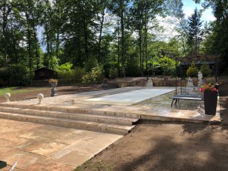 Maçonnerie paysagère (terrasse, allée, muret, piscine, tennis, fontaine, bassins, escaliers...).